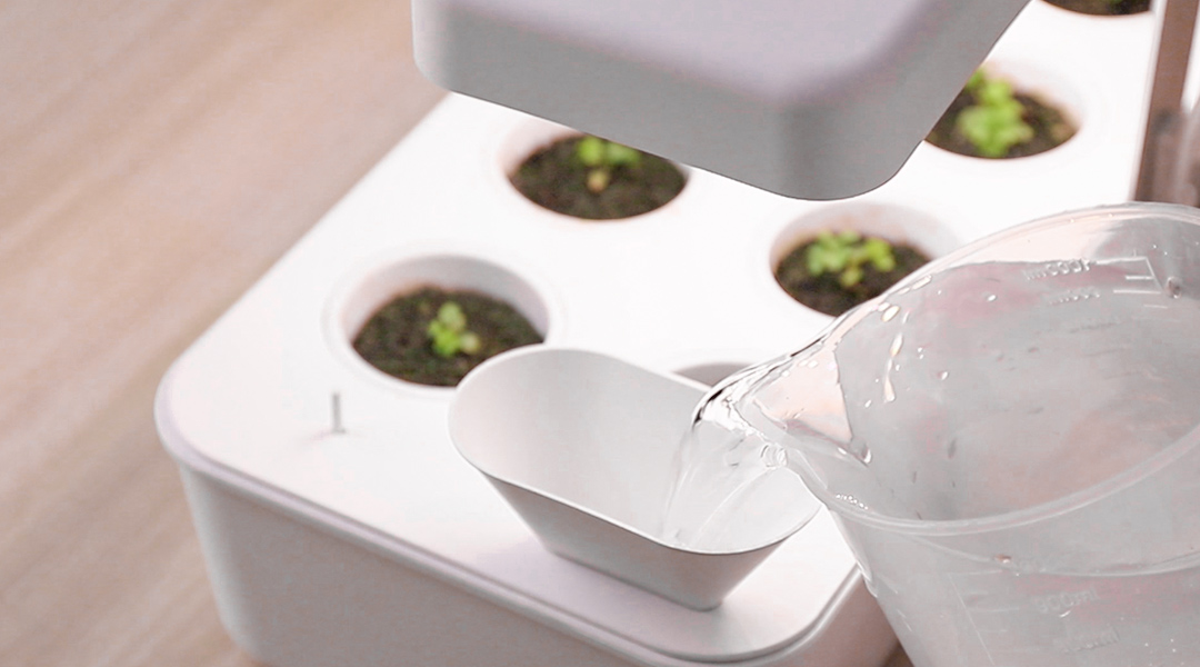 1. After planting, we need to add water. At first, we only need to add about 1L of water to the Min water level in the hydroponic box, and only need to add water once within 12 days, because the seeds do not need too much water for germination. It can cause mold to grow on the surface of the substrate.