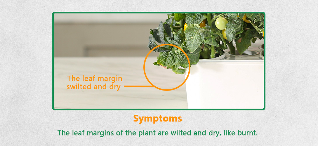 Symptoms: The leaf margins of the plant are wilted and dry, like burnt.
