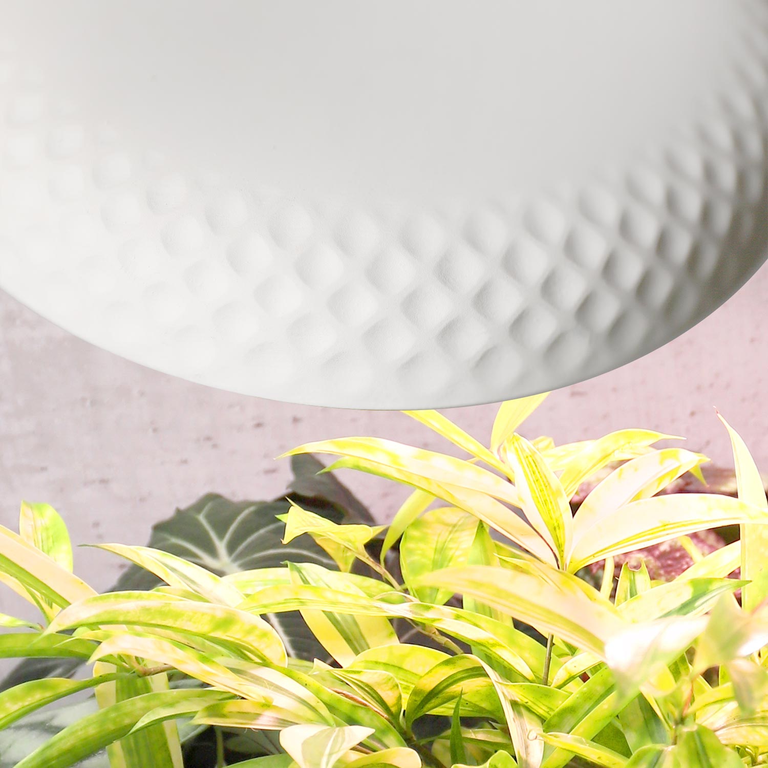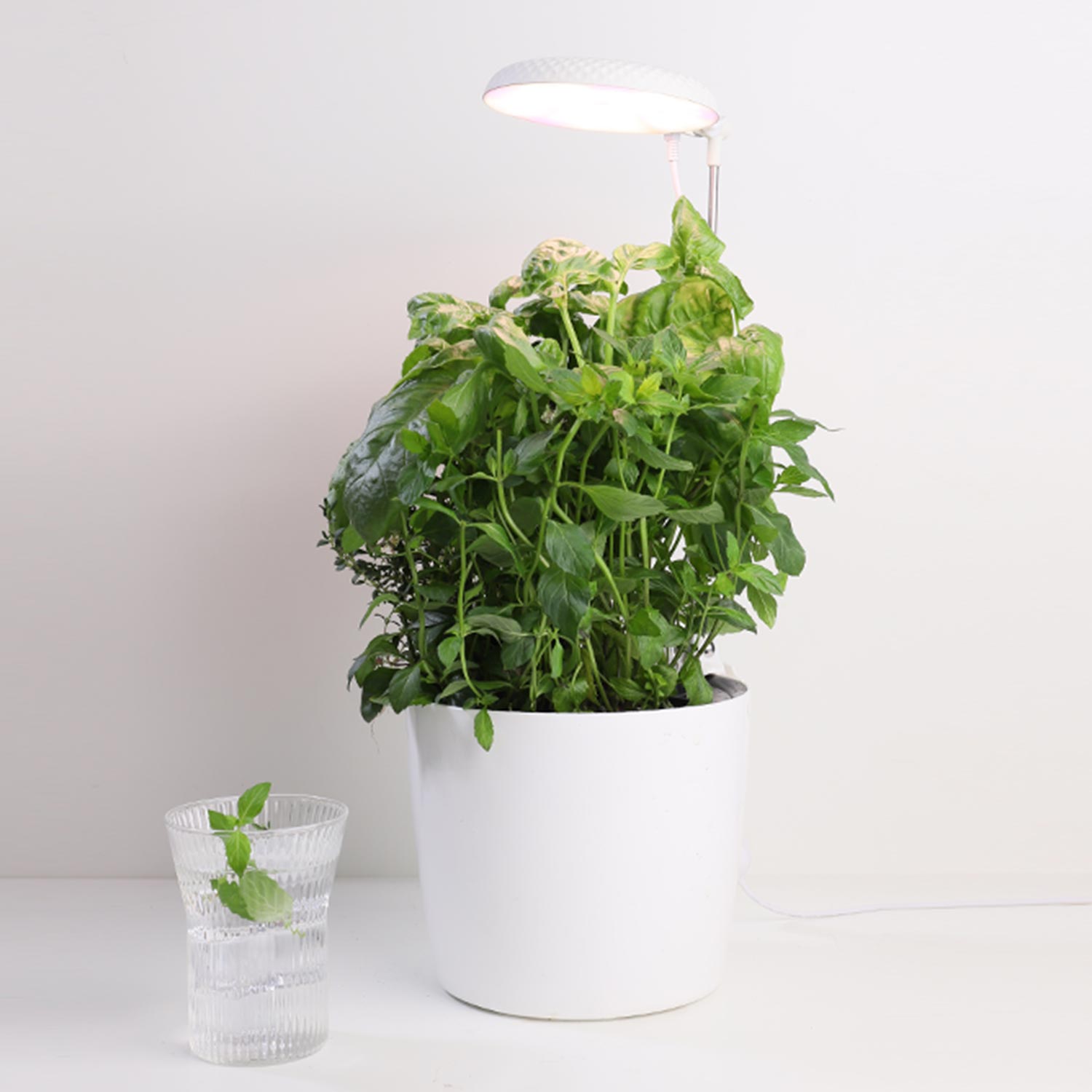 This led grow lights is called pot light. It can match with various pots, from small pot like this 4 inch pot, and when you click on our pot light, and even when the pot is empty, and this pot will not fall down. And when it clicks onto big pot with crimping, stylish grow lights can also perfectly match. There is a pointer on the end, this is the second way to use. You could just plug it into the soil, if you don’t want to click onto the pot.